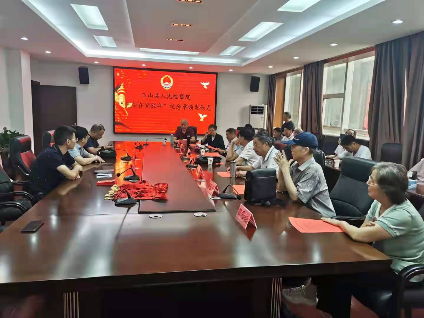 一百年波澜壮阔,五十载初心如磐。为庆祝中国共产党成立100周年,6月30日上午,玉山县检察院举行了“光荣在党50年”纪念章颁发仪式,党组书记、检察长吴伯翔为9名50年以上党龄的老党员颁发了纪念章,并代表党组向老党员送去慰问与关怀。