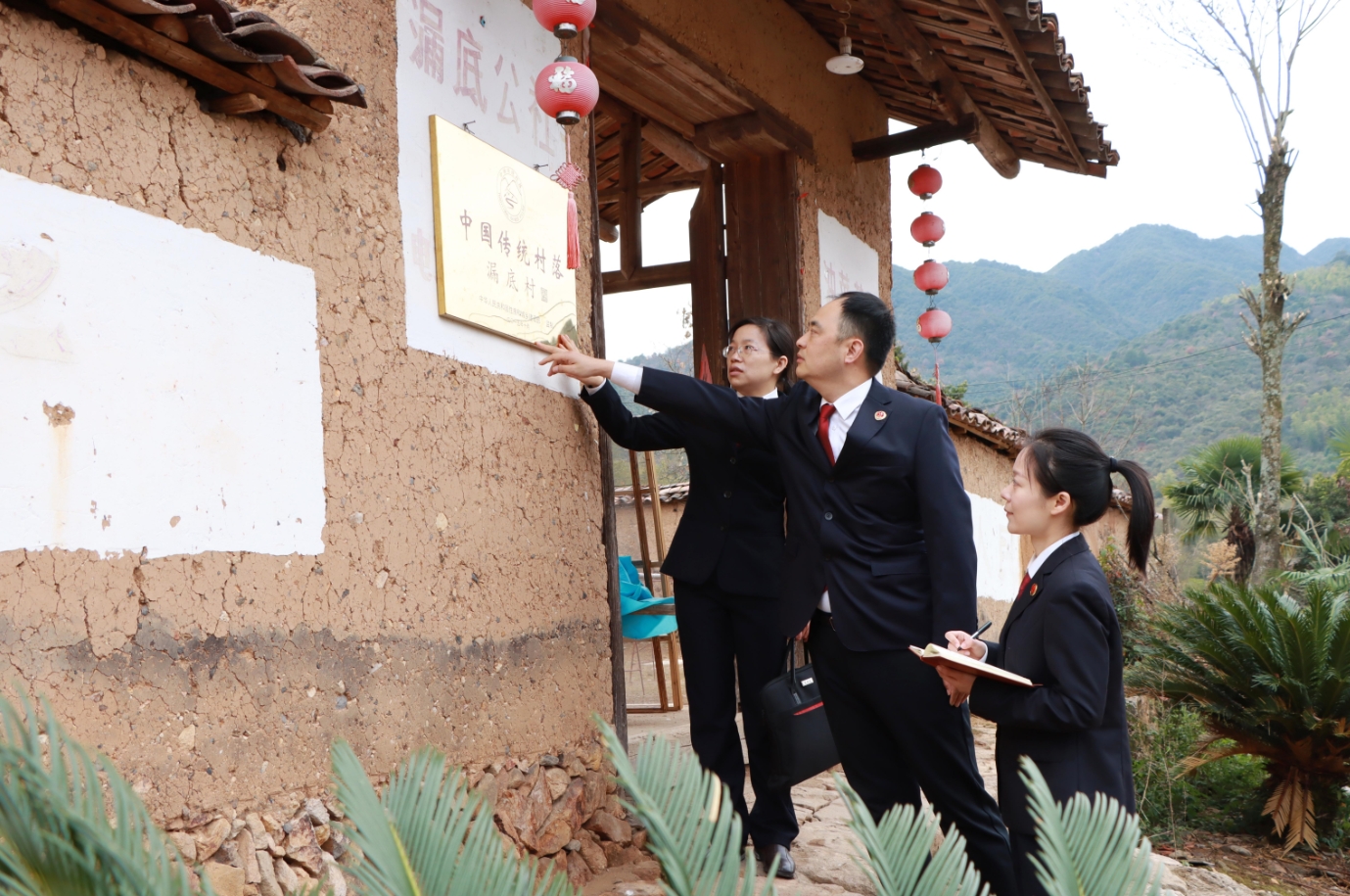 党组书记检察长陈雷,带领检察官查看漏底古村落,挂牌保护情况