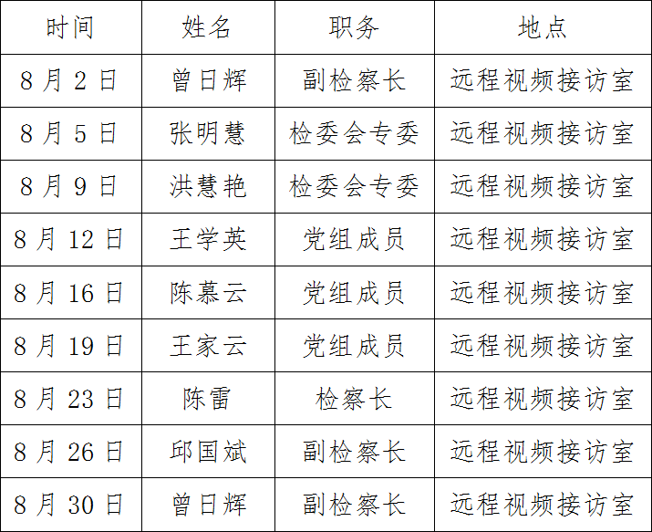 为深入贯彻习近平法治思想,全面生动展示新时代检察机关坚持以人民为中心发展思想的政治自觉、行动自觉,倾听群众心声,解决群众诉求,扎实做好检察长接访工作,提升我院控告申诉工作质效,推动案结事了人和,现将我院8月开展检察长接访安排表公布如下: