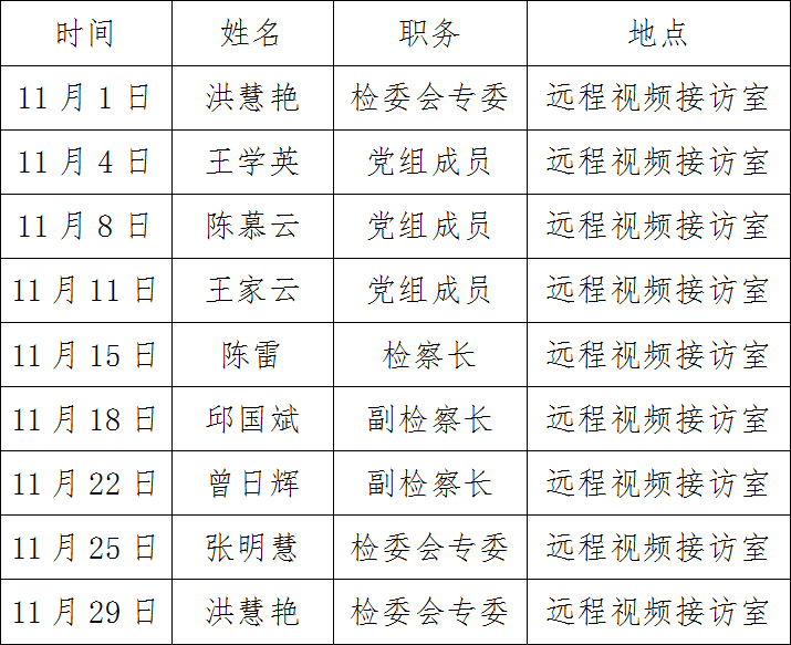 为深入贯彻习近平法治思想,全面生动展示新时代检察机关坚持以人民为中心发展思想的政治自觉、行动自觉,倾听群众心声,解决群众诉求,扎实做好检察长接访工作,提升我院控告申诉工作质效,推动案结事了人和,现将我院11月开展检察长接访安排表公布如下: