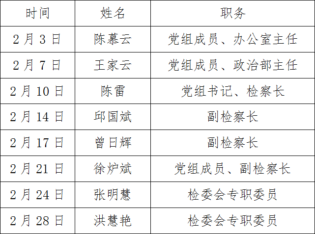为深入贯彻习近平法治思想,全面生动展示新时代检察机关坚持以人民为中心发展思想的政治自觉、行动自觉,倾听群众心声,解决群众诉求,扎实做好检察长接访工作,提升我院控告申诉工作质效,推动案结事了人和,玉山县人民检察院公布2月份“检察长接访”安排:
